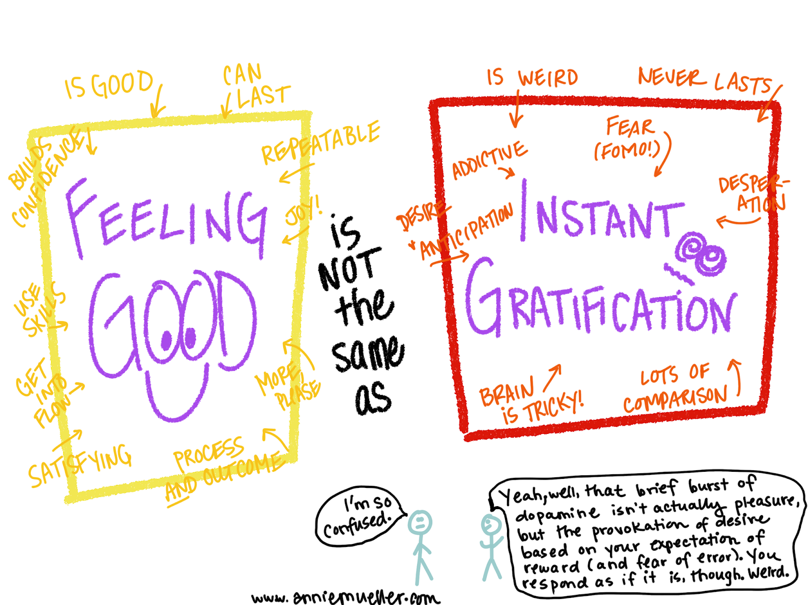Instant gratification is all about the anticipation, prediction or desire. It's about the hope of feeling good. Feeling good on the other hand is just that, feeling good during the process and during the outcome